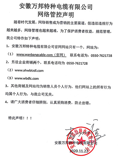 鄭重聲明:安徽萬邦特種電纜有限公司官方網站為:www_wanbangcable_com.600800.com.cn,除此之外無任何子網站或合作網站,其余均為假冒偽劣。電話:0550-7621728 13485756353 地 址:安徽省天長市滁州高新技術產業開發區經四路29號